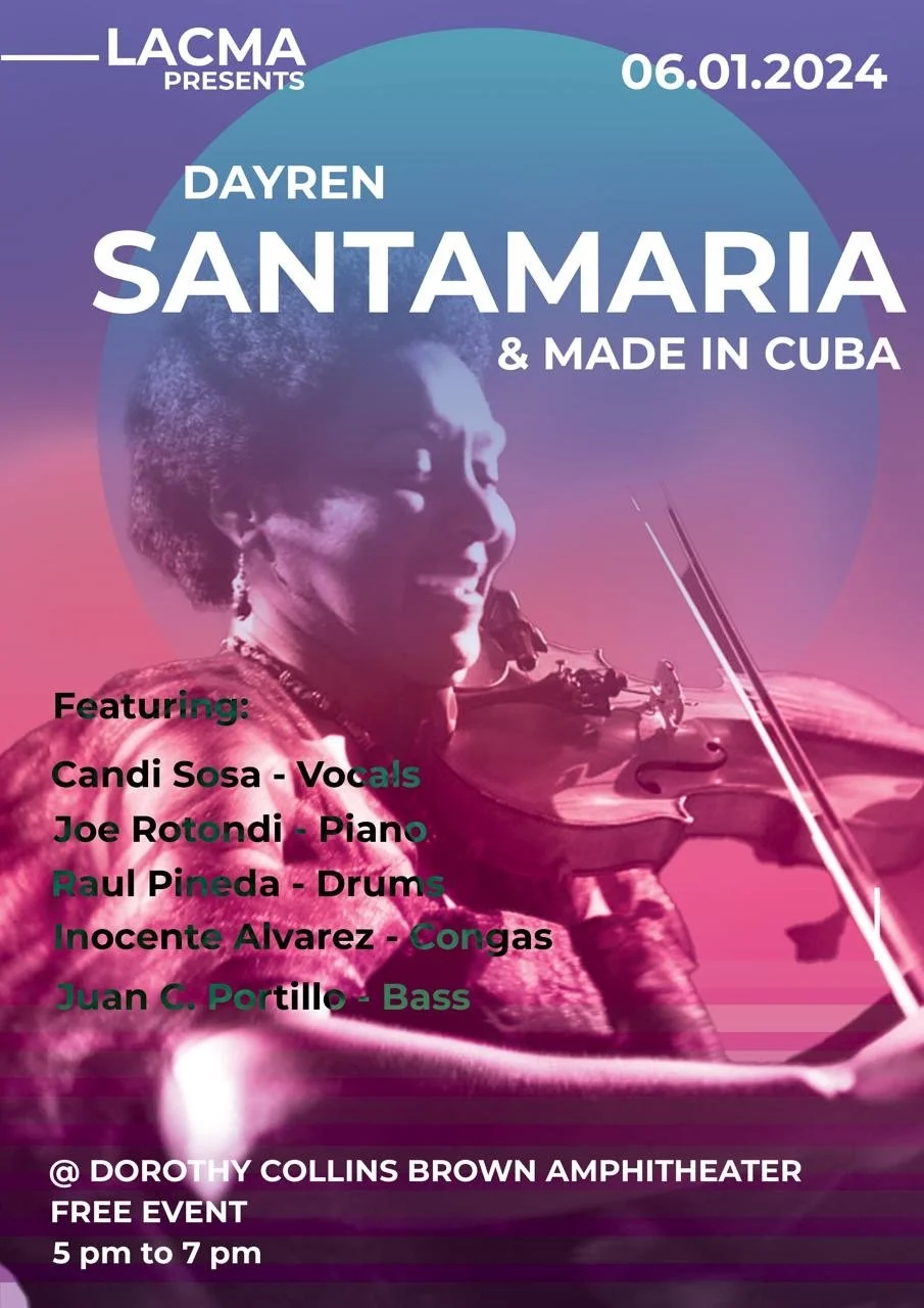 Dayren Santamaria & Made in Cuba @ LACMA Saturday, June 1, 2024 4:00 PM 7:30 PM 16:00 19:30 Google Calendar ICS Dayren Santamaria & Made in Cuba @ LACMA